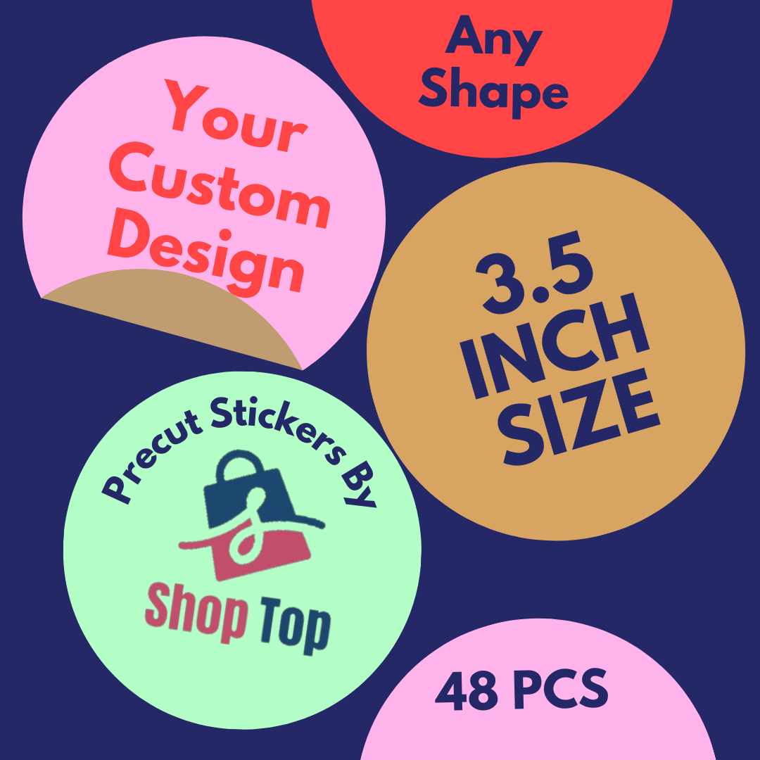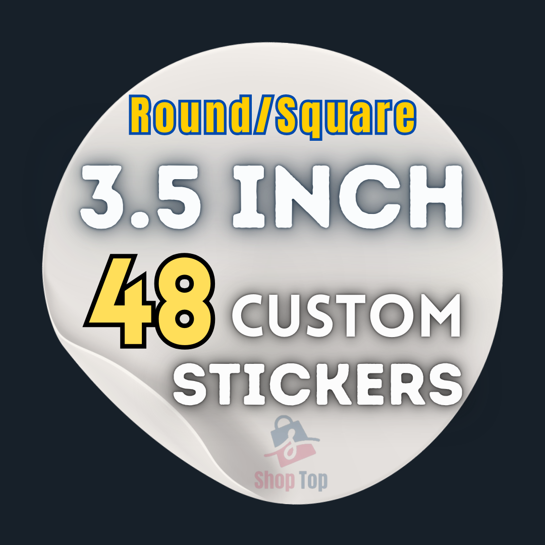 Get 48 custom stickers in any shape, sized 3.5 inches, perfect for product labels and brand logos. High-quality design by Shop Top, ideal for personalizing your business. Order today and get the perfect stickers you are looking for.